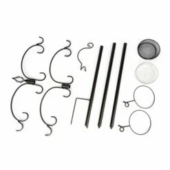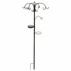 This feeding system consists of 4 arms with 2 hooks at the end of each arm to hang different types of feeders. Lower on the pole you can attach an extra hook to offer smaller treats as well as another two dishes. One dish is suitable for offering a feed mix or mealworms and the other dish is for water.