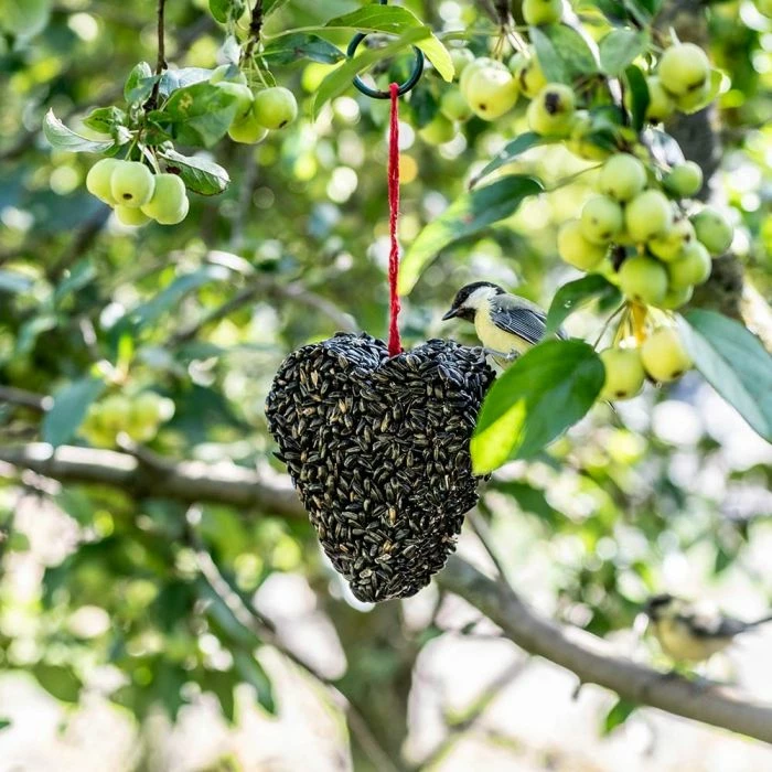 The beautiful shape is equipped with a hanging cord with which you can hang it in any desired place. The sunflower core heart is a delicious delicacy for birds and moreover, it looks nice in any garden.