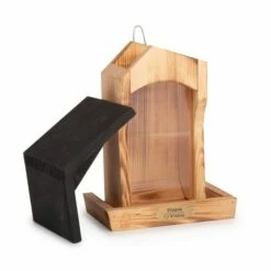 This feeder is made from wood has an attractive flamed surface and complimentary black roof. The wood has been thermally modified by heating in an oxygen depleted environment at more than 180⁰C. This causes a chemical change in the structure of the wood that increases its durability and, we think, is also very attractive to look at. The lack of oxygen means the wood has been gently carbonised, giving a unique look to every feeder.