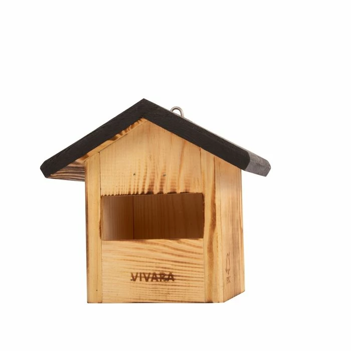 This nest box made from wood has an attractive flamed surface and complimentary black roof. The wood of this series of nesting boxes has been thermally modified by heating in an oxygen depleted environment at more than 180⁰C. This causes a chemical change in the structure of the wood that increases its durability and, we think, is also very attractive to look at. The lack of oxygen means the wood has been gently carbonised, giving a unique look to each box.